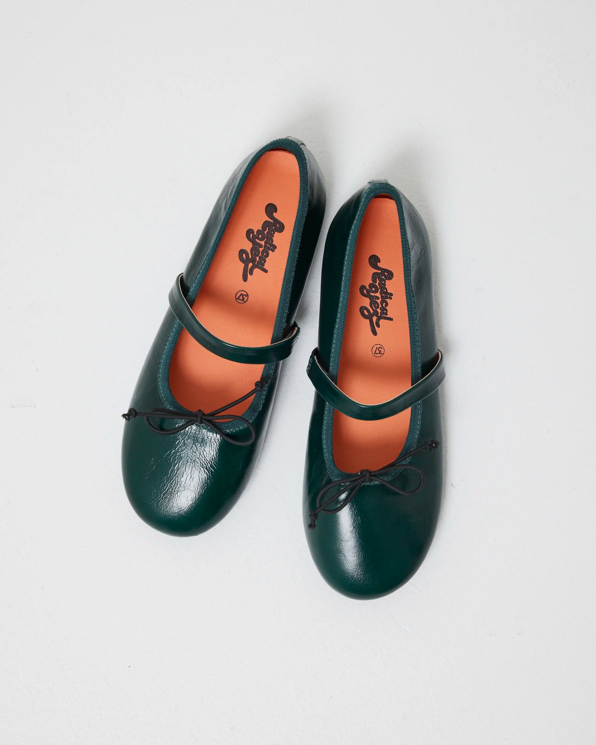 A nod to the classic ballet flat silhouette, but made Radical. Blessed 2.0 blends timeless shape with unexpected detail, now in a high-shine Jade Green that offers versatility and intrigue. We kept the classic rounded toe and low vamp for a refined silhouette, then added a single strap, a neat bow, and our removable insole for all-day ease.