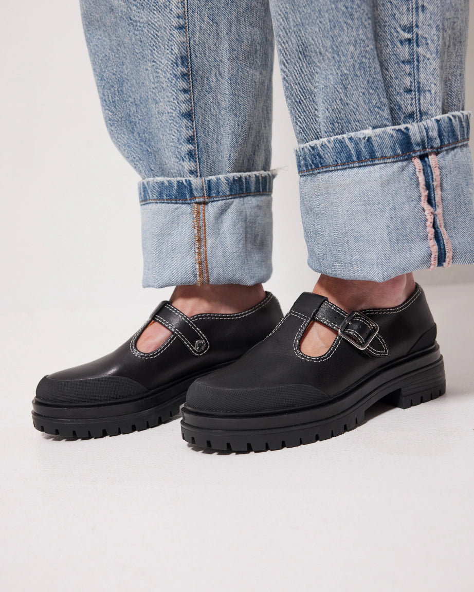 The newest silhouette on our now famous ‘O’ unit. Icehouse Street T-bar is the hybrid flat, wear-everywhere shoe of your dreams! Drawing inspiration from the classic T-Bar silhouette, this all black silhouette keeps things modern with subtle rubber bumpers and milk topstitch. Radical and Yes!