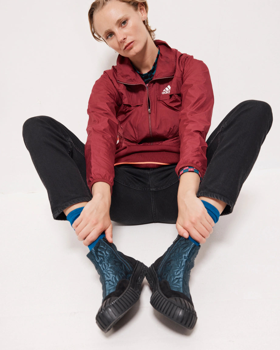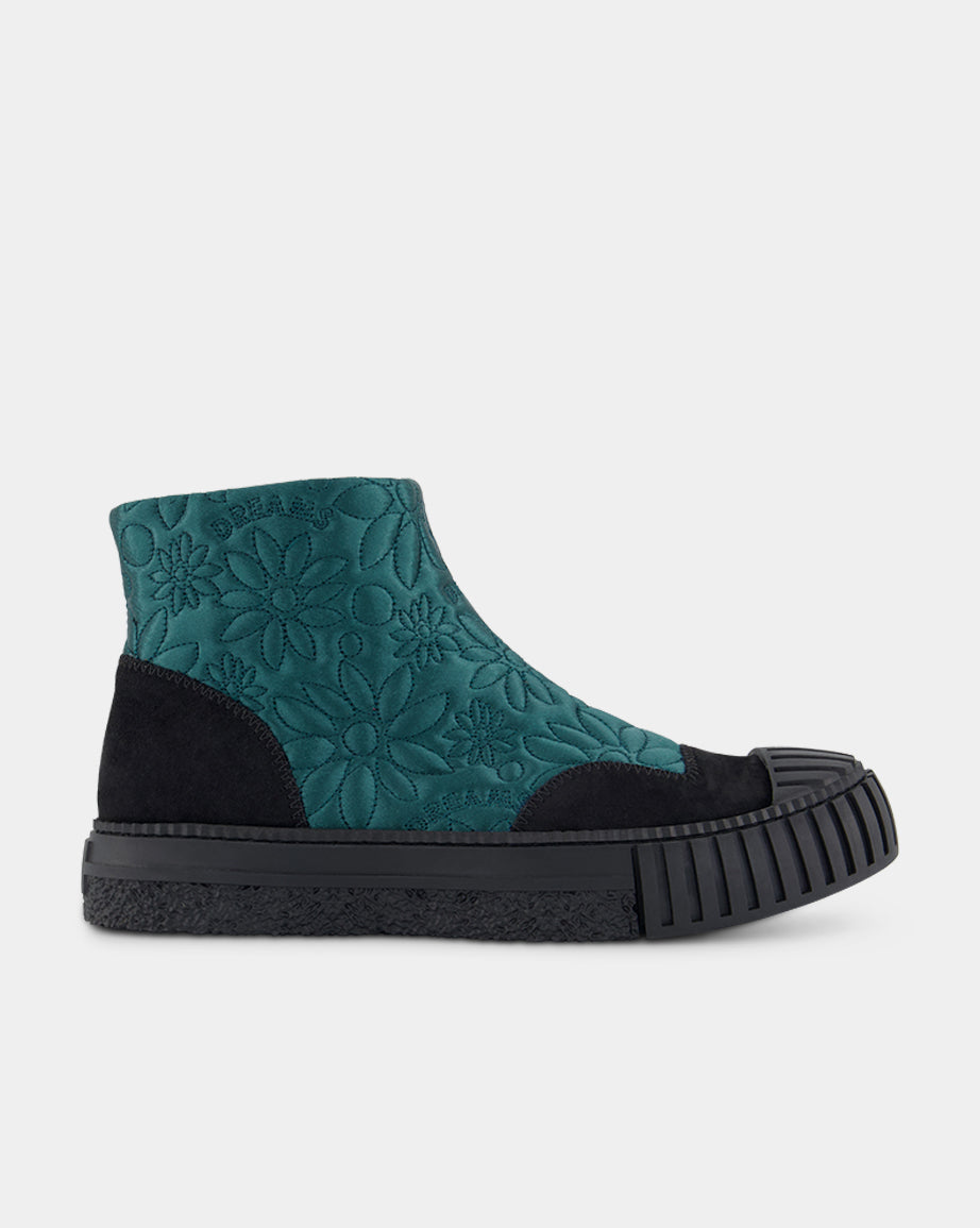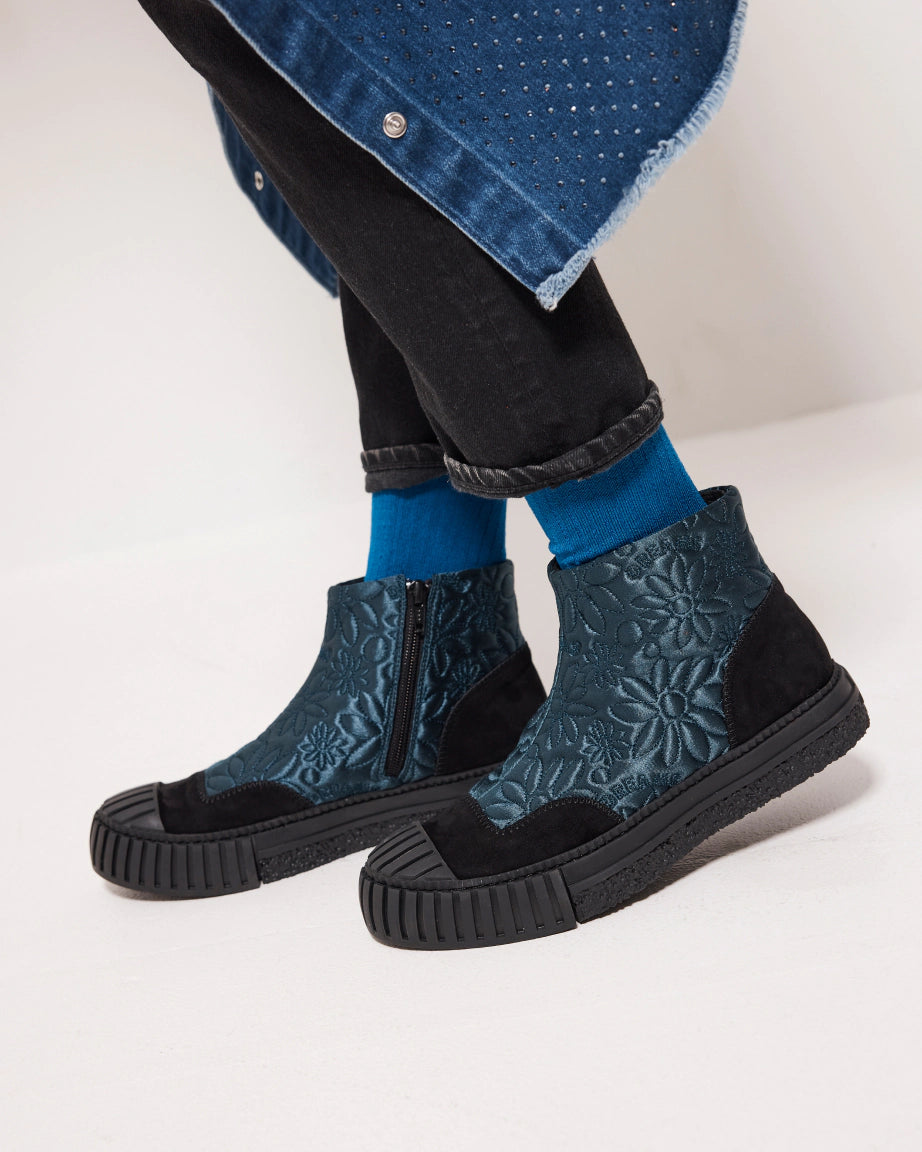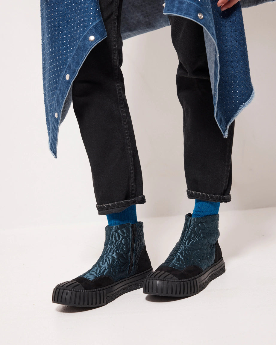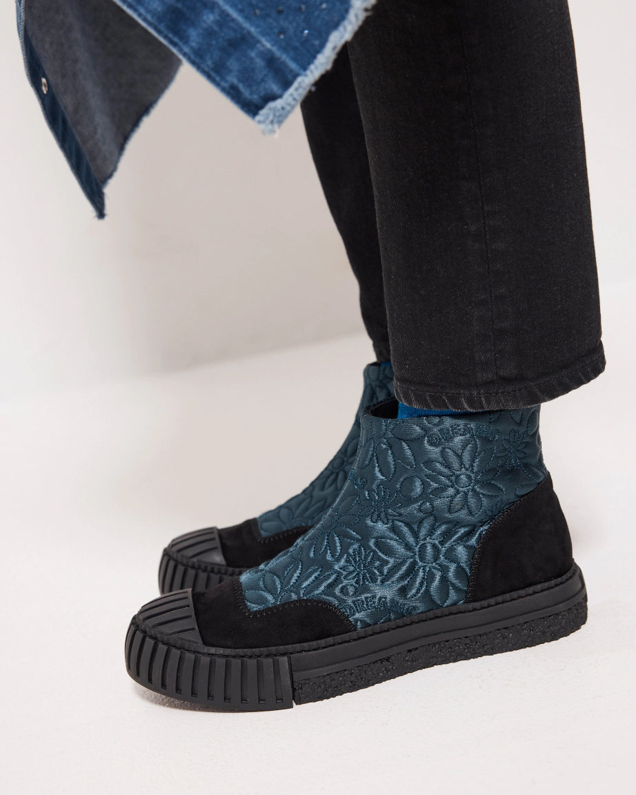 Limited edition and conversational. The Daisy Dreams boots explore the ethos of pretty-tough dressing. Sock-esque in silhouette, pitch perfect petrol neoprene, featuring our top stitched daisy dreams embroidery, set atop our fan favourite 'Future' outsole. Radical and Yes!