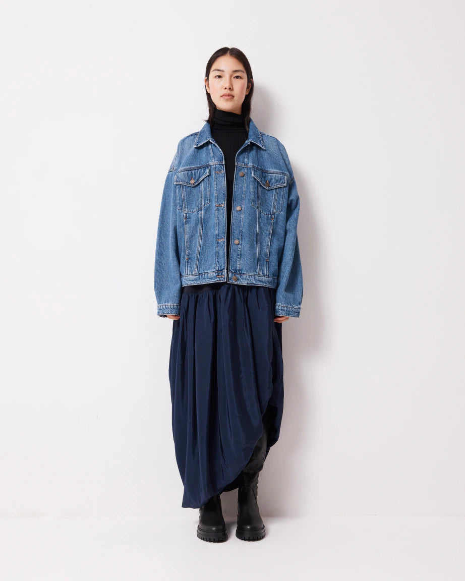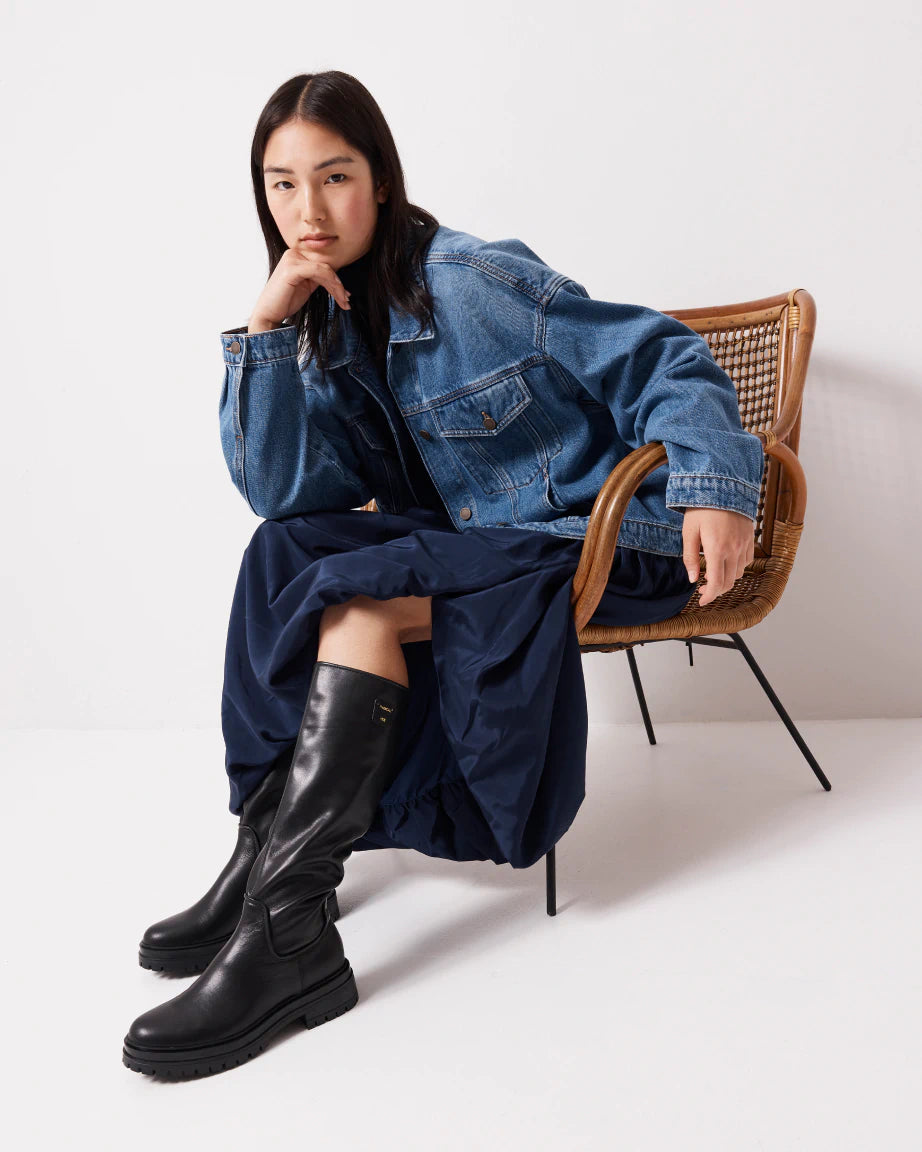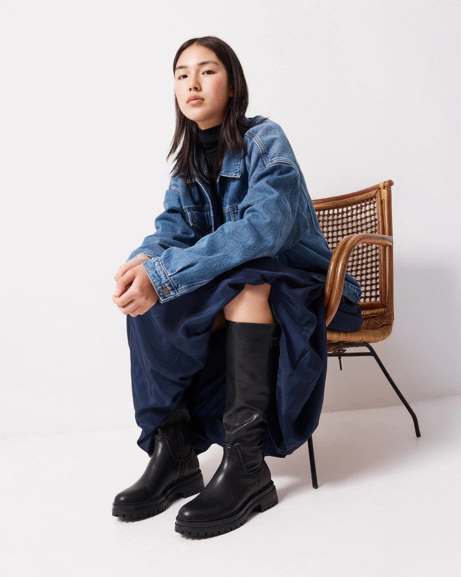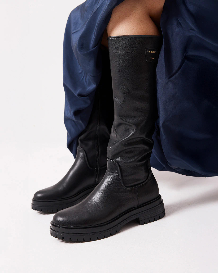 Both the second and the tallest of all of the tall boots we have ever created, Patience was inspired from a place of wanting to get dressed up and be out in the world during a cold winter's day. Taking the elegance of a riding boot and adding the toughness of a motorcycle boot, Patience features an exaggerated bucket boot design and an irregular patched gold foil Radical Yes stamp. Radical and Yes!