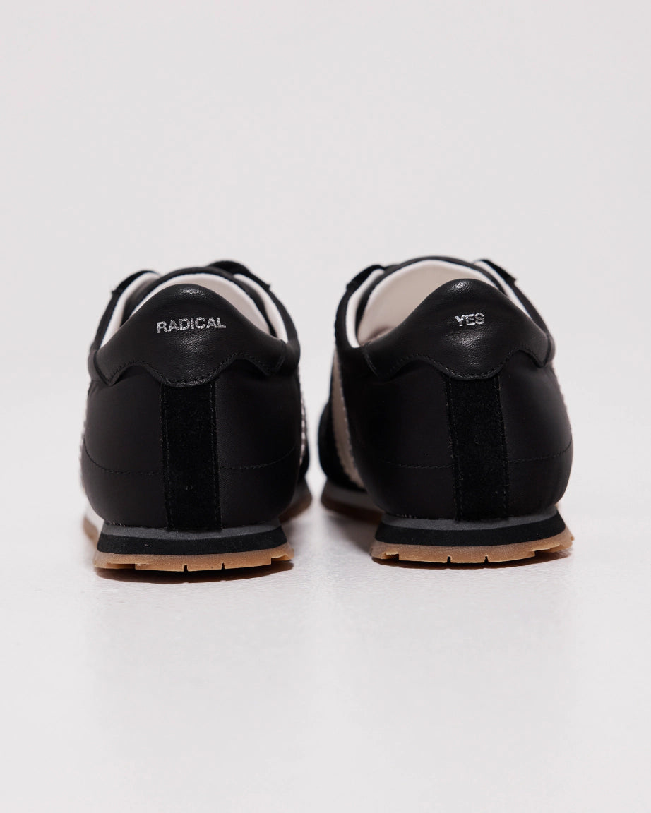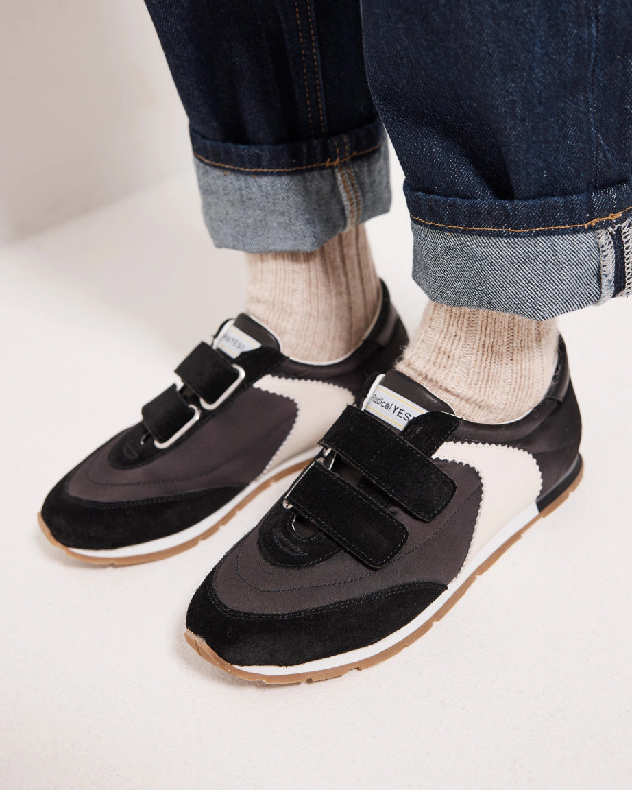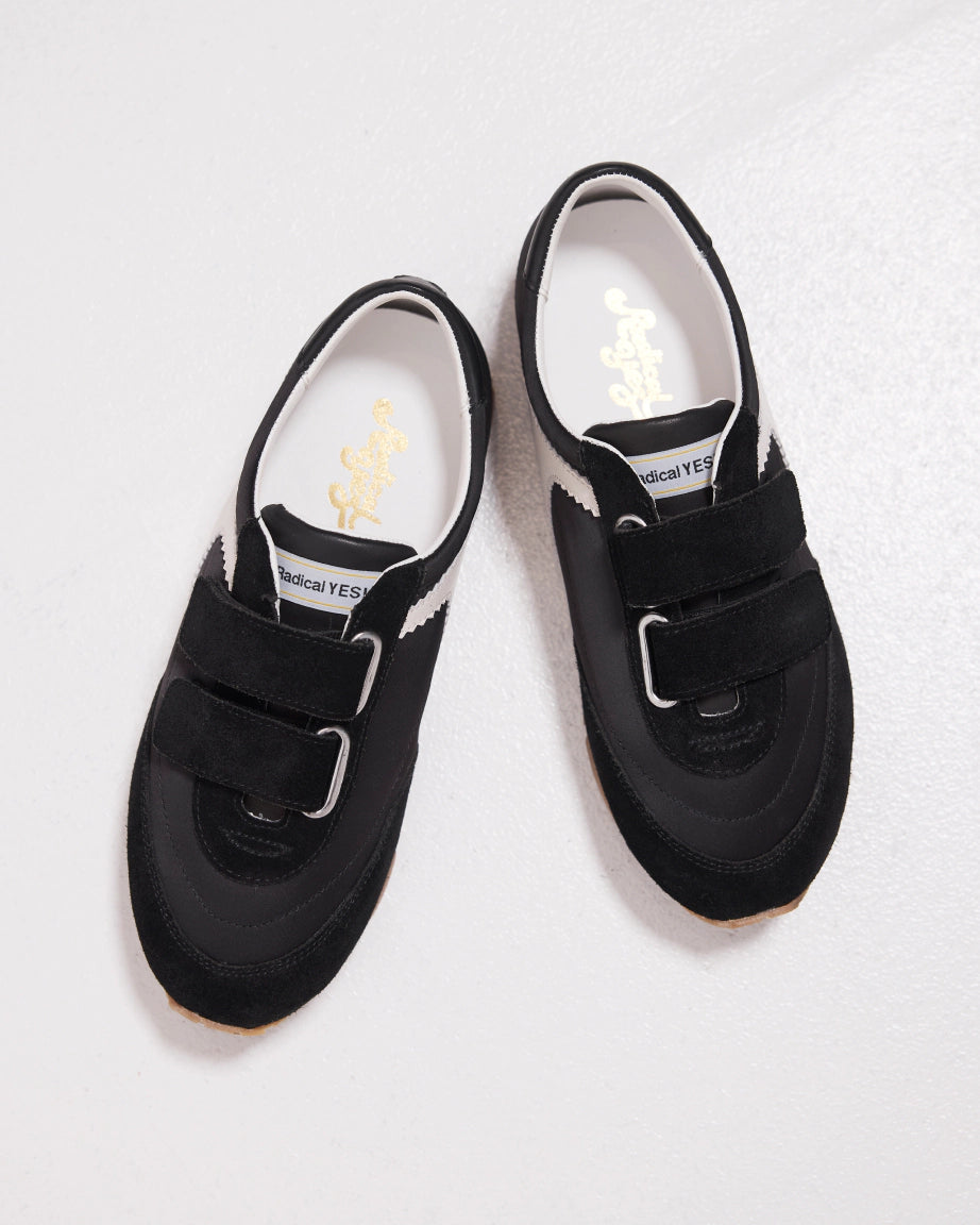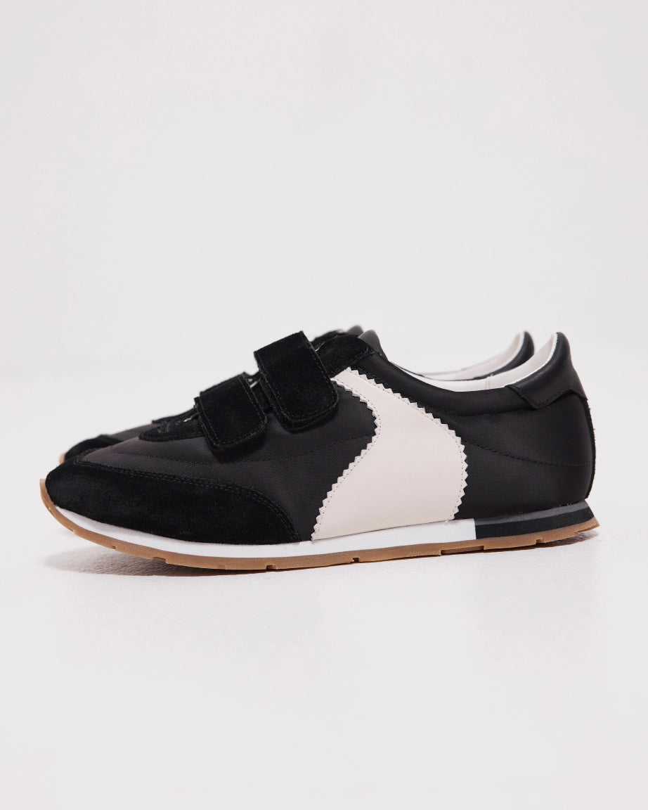 Meet the Velcro Core Sneaker. A vintage inspired low profile sneaker with a double velcro strap twist. It's all about easy wear and modern functionality for this active silhouette made sharp. Crafted from black satin, spliced with suede sliced with crisp white zigzag cut leather. Radical and Yes!