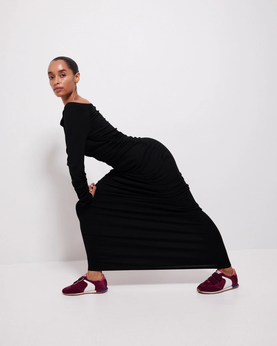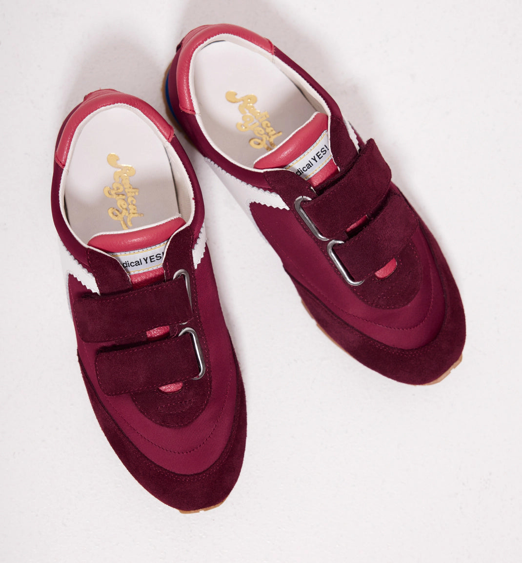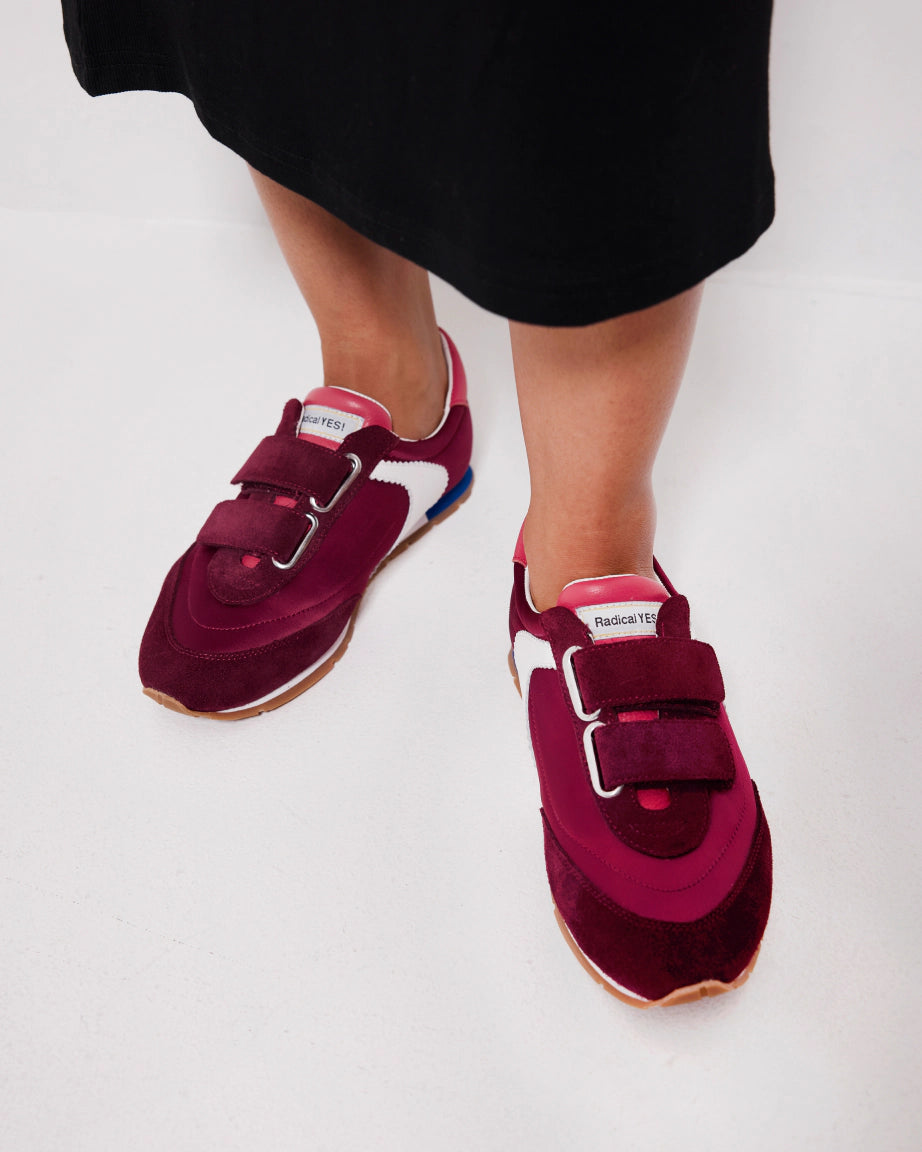 Meet the Velcro Core Sneaker. A vintage inspired low profile sneaker with a double velcro strap twist. It's all about easy wear and modern functionality for this active silhouette made sharp. Crafted from cherry satin, spliced with suede sliced with crisp white zigzag cut leather. Our favourite part - the pop of royal blue at the EVA heel. Radical and Yes!
