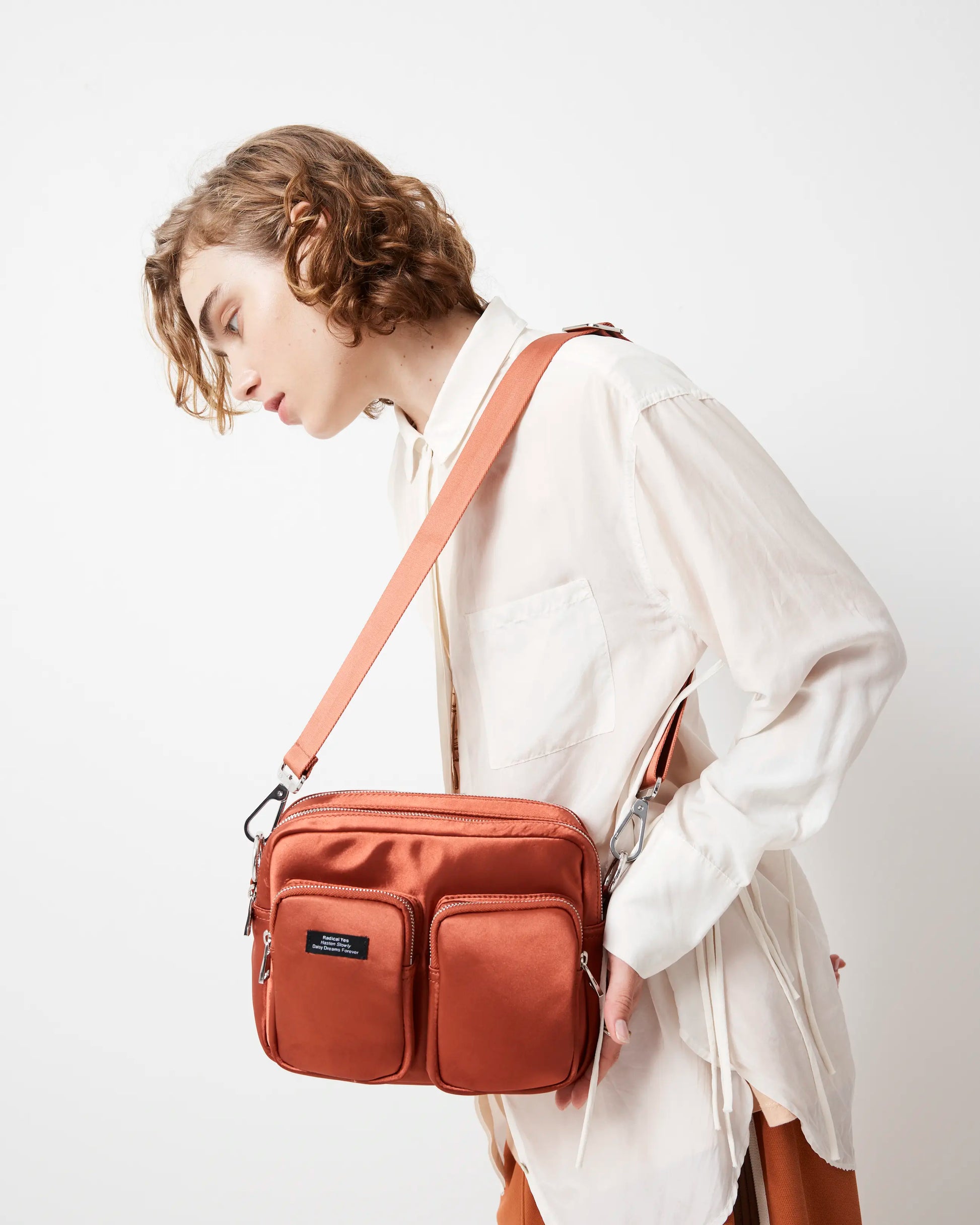 Featuring two much-requested external pockets and a clever dual-panel interior, this bag is designed to keep your essentials organised while you’re on the move. The clay sporty satin nylon is spliced with our signature beige lining and finished with our custom-branded hardware. Radical and Yes!