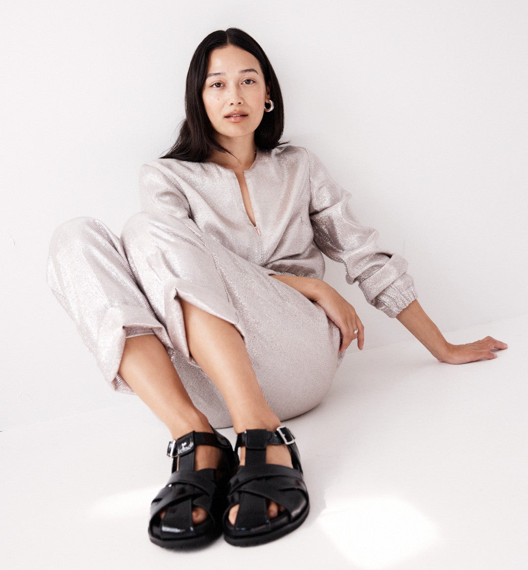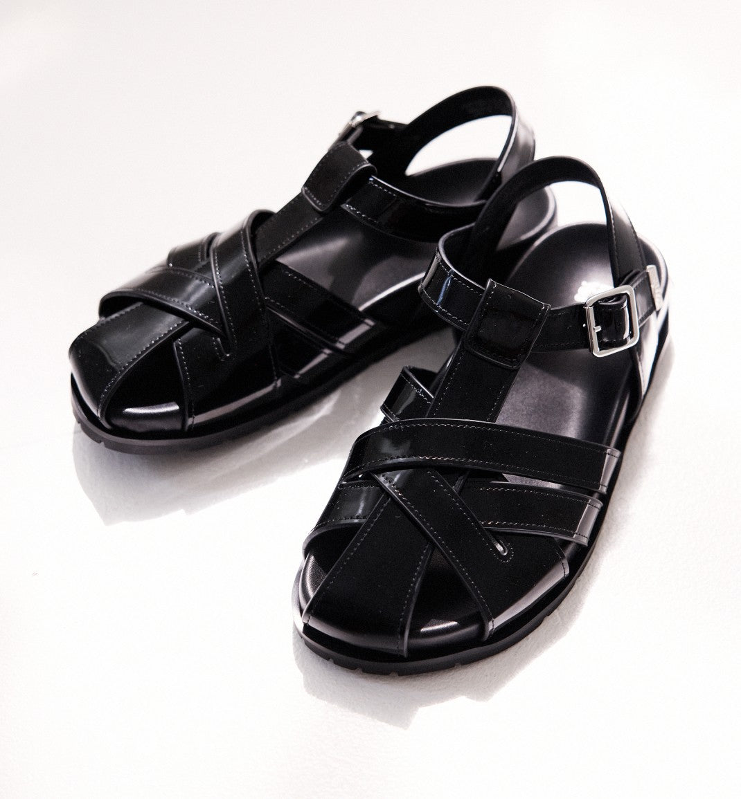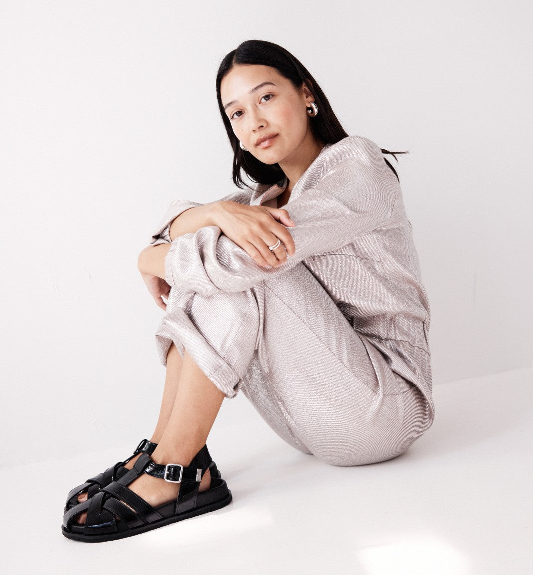 A love letter to our classics, the Ginny Sandals are a fusion of two Radical Yes icons: The Sophia Strappy Sandal and the Arkestra Fisherman Sandal. A playful criss-cross silhouette meets the sharp elegance of luxe patent black leather, finished with a smooth black leather footbed. It’s Radical. It’s Yes.