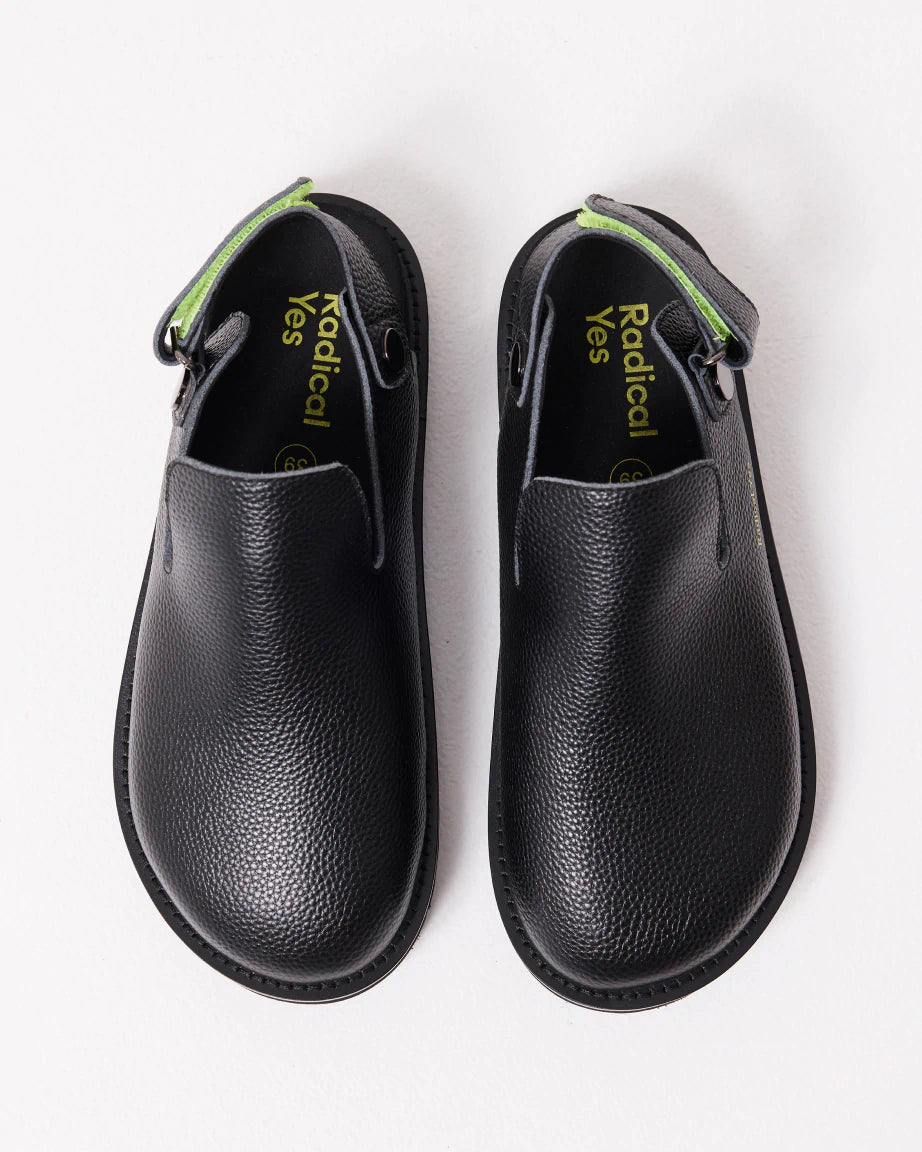 You asked, we delivered - Adventure Awaits are back. Part slip on, part clog. Fully radical and fully perfect for active lounging. For this style the luxe tumbled black leather is contrasted with a pop of lime green velcro. Radical and Yes!