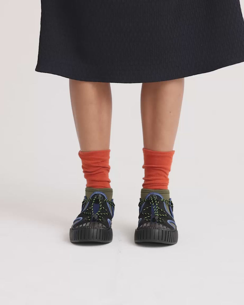 Tokyo arrives this season in a rich autumnal palette: layers of cardamom, blue, and black, finished with speckles of vibrant yellow for a Radical twist. This effortless, ankle-height pull-on features our signature gorpcore-inspired overlay and soft neoprene upper. Grounded by a proprietary black rubber outsole that extends into a protective toe-cap, Tokyo balances a rugged, athletic edge with a refined, sophisticated silhouette.
