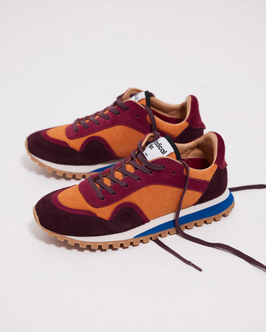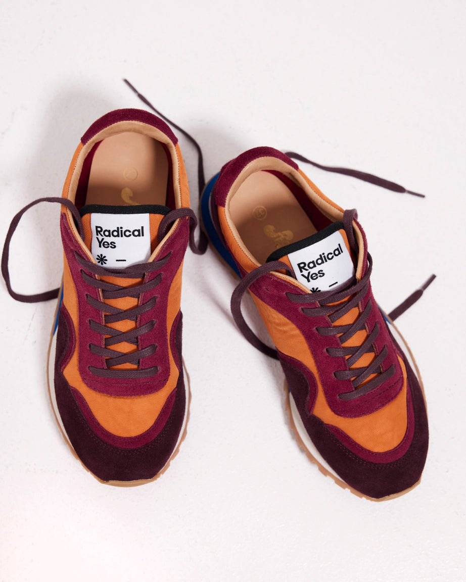 Meet Moon Street, our new sneaker silhouette, designed to inspire joy, positivity and a new point of view. A nod towards retro styling, Moon Street is lightweight and delightfully scrunchable. Mango nylon layered with a pop of plum and cherry suede is intentional clashing at its finest. Radical and Yes!