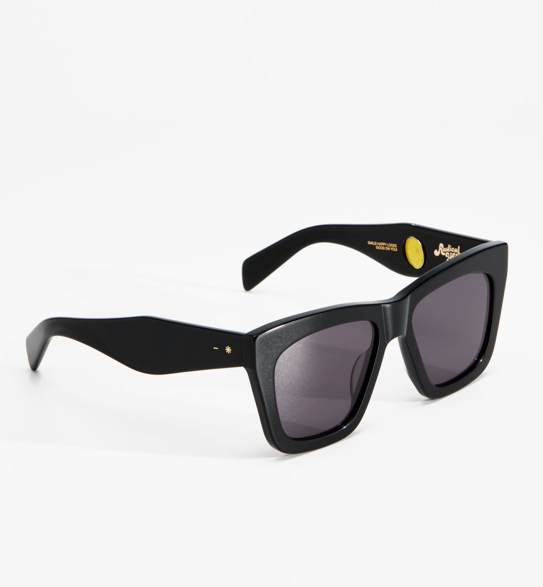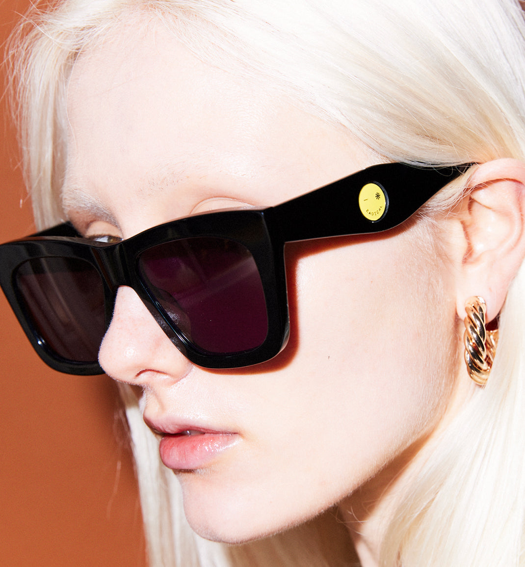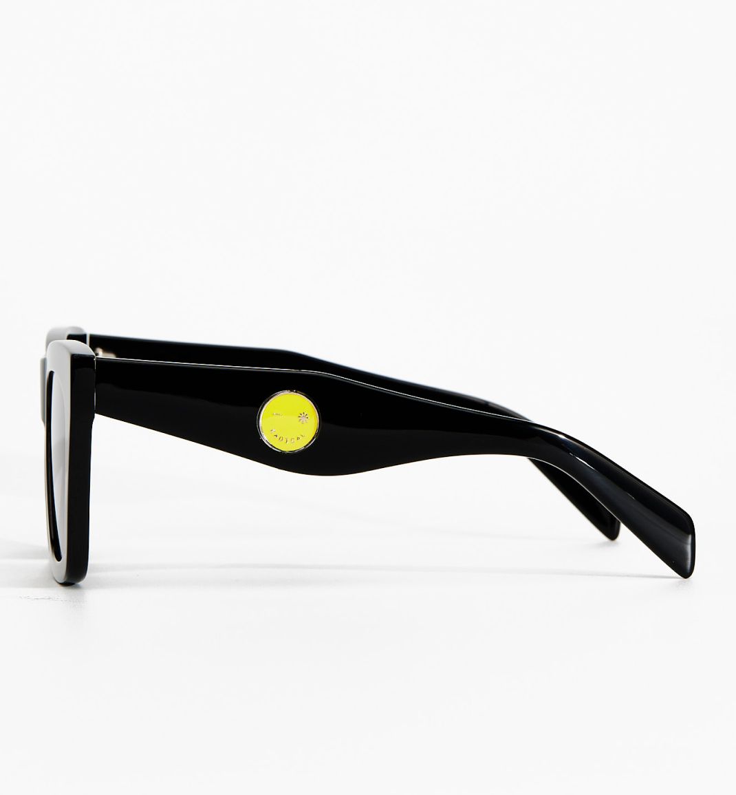 Light Lover is our genderless take on a classic square. This style has lasted the test of time and we’ve updated it with our signature temples and made it generally more Radical. Features our super fun Spinning ‘Winky Face’ badge hardware. Depending on how you feel you can spin to the contrasting yellow side, or you can spin back to the classic and discreet black side. Versatile hardware to suit your mood or your destination.