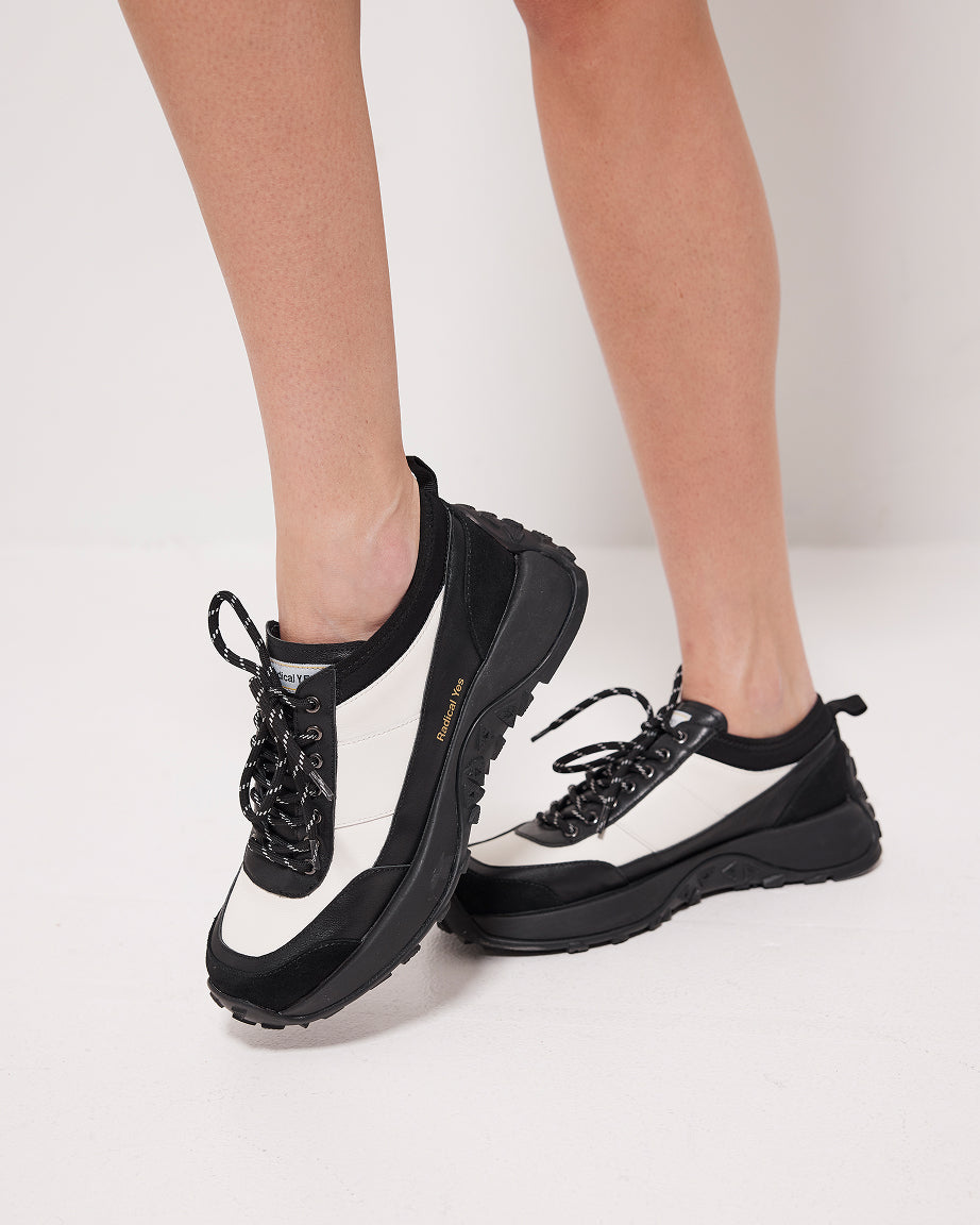 Spliced black and milk leather, make for pretty tough monochromatic dressing. Perfect for those days you just want to kick around in your sneakers but need to look more put together than that in order to be putting your (literal) best foot forward in life.