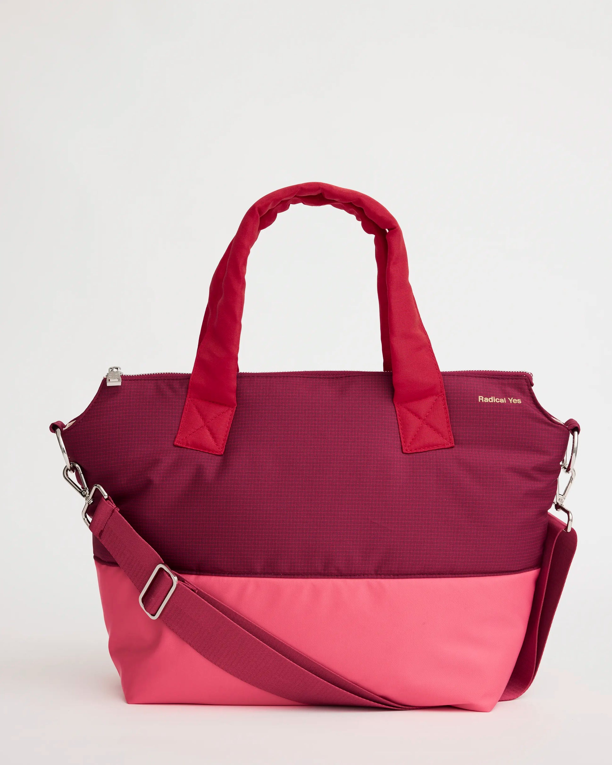 Designed for on-the-go moments, the Maximilian Dance Tote is your IRL, everyday, everywhere, all-the-time bag! For the first time in its history, we’ve reimagined the beloved tote in a sleek splice of pink nylon and cherry ripstop, accented with a punchy red highlight on the handles. Inside, you’ll find our signature beige lining, while the exterior is finished with custom, nickel-free Radical Yes hardware. This bag will get you where you need to go in Radical style!