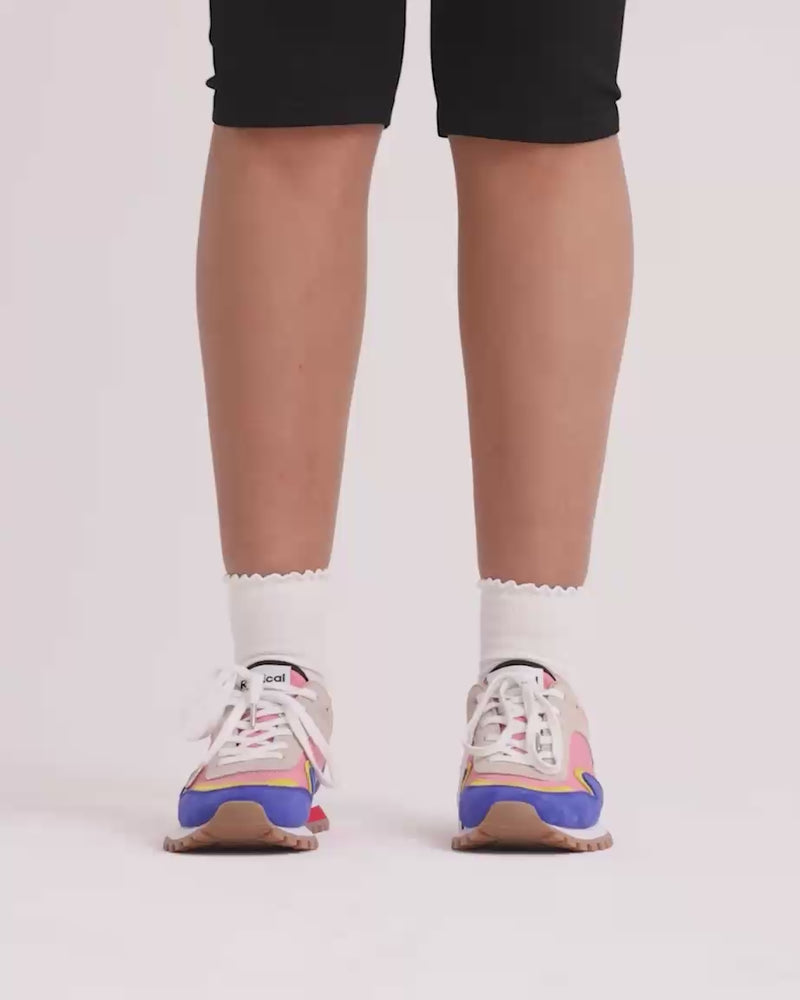 Meet Moon Street, our new sneaker silhouette, designed to inspire joy, positivity, and a new point of view. A nod towards retro styling, Moon Street is lightweight and delightfully scrunchable. Vibrant pink coloured nylon layered with a pop of mustard yellow, Klein blue and stone suede is intentional clashing at its finest. Radical and Yes!