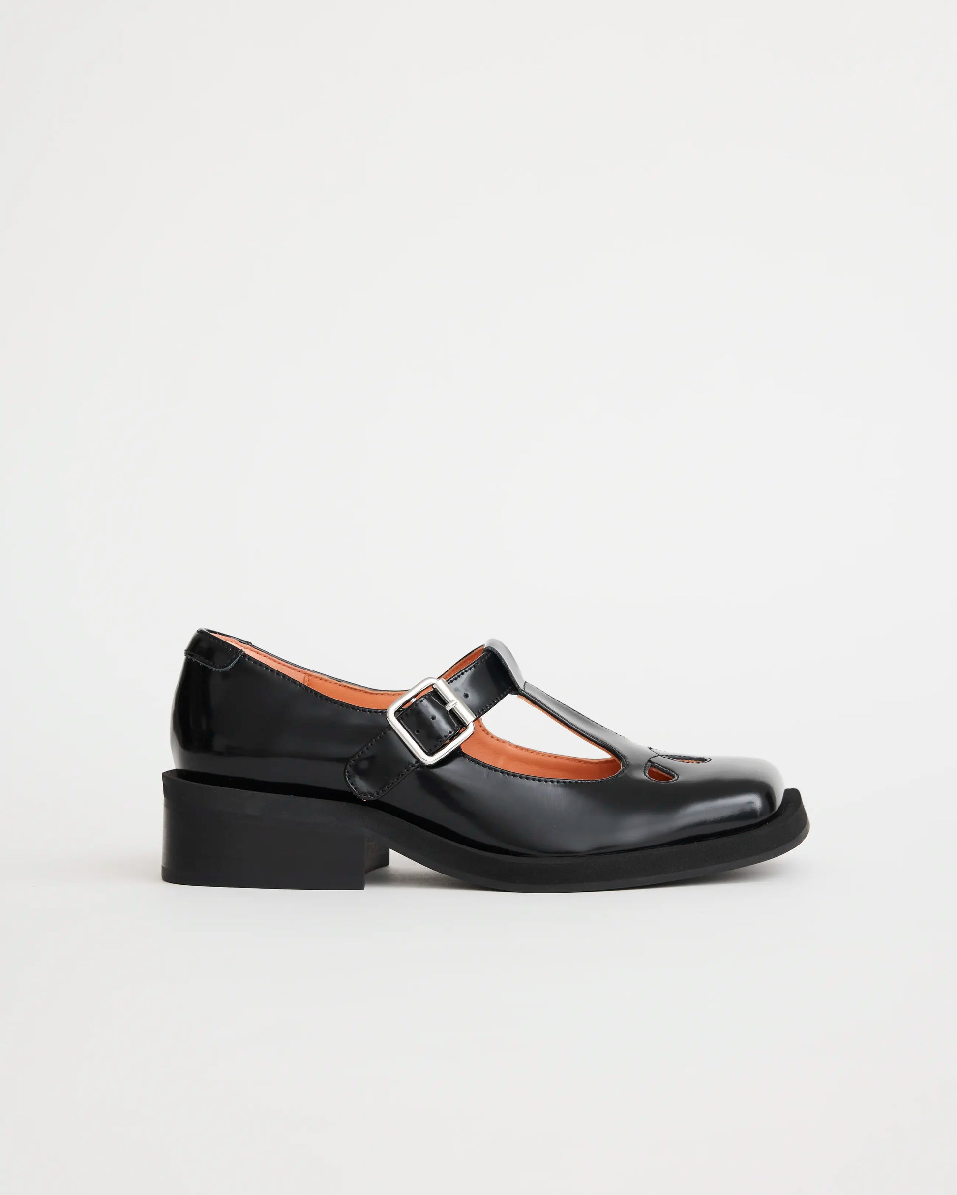The Thelma Square Toe Shoe is a sharp, modern evolution of the classic T-Bar silhouette. Built on our celebrated Monae last, it balances a structured look with a soft, lived-in feel. Riffing on the traditional school shoe, Thelma is designed for the modern creative who wears a deliberate personal uniform to signify her artistic identity. Featuring an exaggerated square toe and distinctive tear-shaped cutouts with delicate connecting stitch details, the mood is one of refined playfulness. The architectural exposed rand through the sole anchors the design, offering a contemporary finish to this high-shine black leather staple. Designed for life in motion, Thelma features an inbuilt memory foam cushioned footbed, ensuring high-rotation ease from the very first wear.